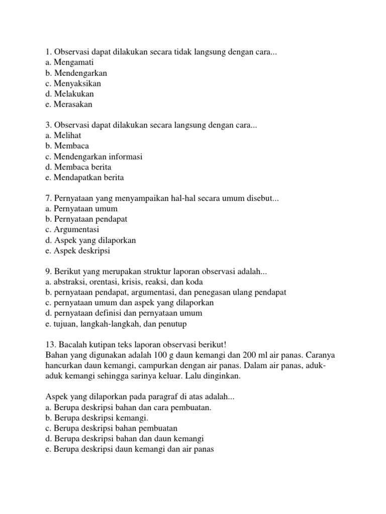 Observasi adalah keterampilan penting dalam berbagai bidang, mulai dari sains hingga seni. Kemampuan untuk mengamati dengan cermat, mencatat detail, dan menarik kesimpulan berdasarkan pengamatan merupakan fondasi dari pembelajaran dan pemahaman yang mendalam. Artikel ini menyajikan 20 soal objektif tentang observasi yang dirancang untuk siswa kelas 1 SMA. Setiap soal disertai dengan pembahasan untuk membantu siswa memahami konsep dan meningkatkan keterampilan observasi mereka.