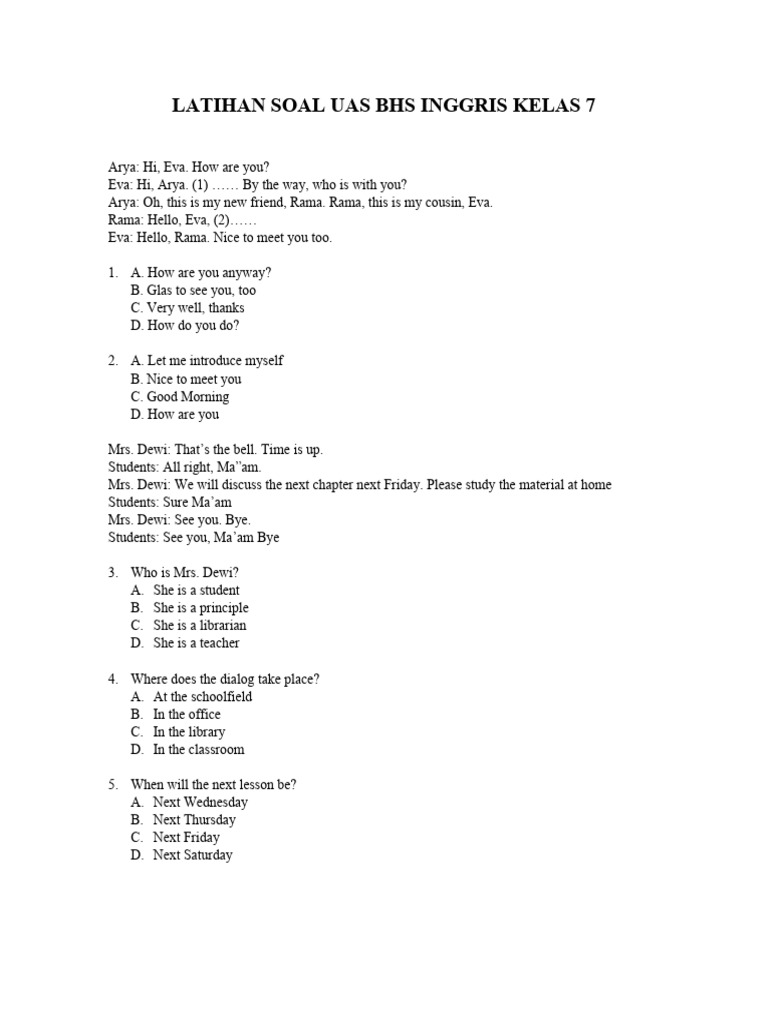 Ujian Akhir Semester (UAS) Bahasa Inggris kelas 7 adalah momen penting untuk mengukur pemahaman siswa terhadap materi yang telah dipelajari selama satu semester. Persiapan yang matang adalah kunci untuk meraih hasil yang memuaskan. Artikel ini menyajikan 25 contoh soal UAS Bahasa Inggris kelas 7 semester 1, dilengkapi dengan pembahasan mendalam dan strategi belajar yang efektif. Dengan berlatih soal dan memahami konsep-konsep kunci, siswa akan lebih percaya diri dan siap menghadapi ujian.