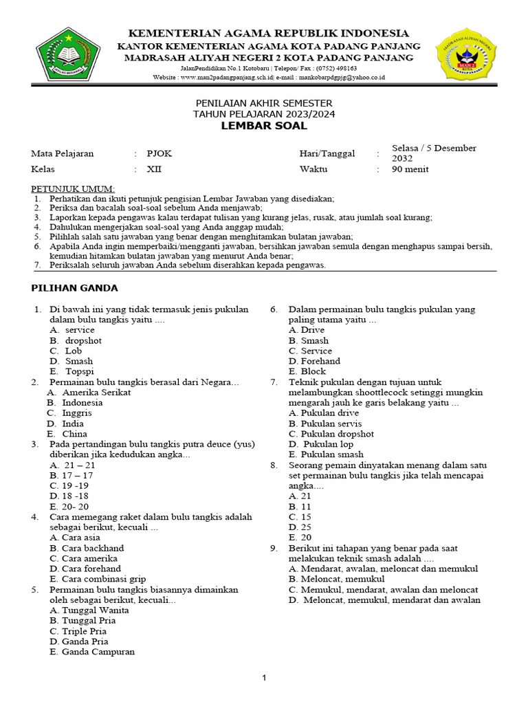 Artikel ini akan membahas secara mendalam tentang soal-soal PJOK kelas 12 semester 1, meliputi materi yang diujikan, contoh soal, tips belajar, dan strategi menghadapi ujian. Dengan pemahaman yang komprehensif, siswa diharapkan dapat mempersiapkan diri secara optimal dan meraih hasil yang memuaskan.